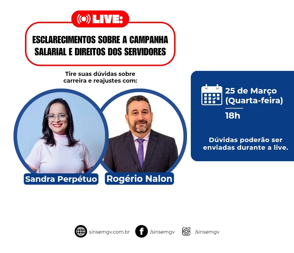 O Sinsem-GV realiza nesta quarta-feira (25), às 18h, uma live para esclarecer dúvidas dos servidores sobre temas relacionados à carreira e à Campanha Salarial. A transmissão será feita pelo Instagram @sinsemgv.